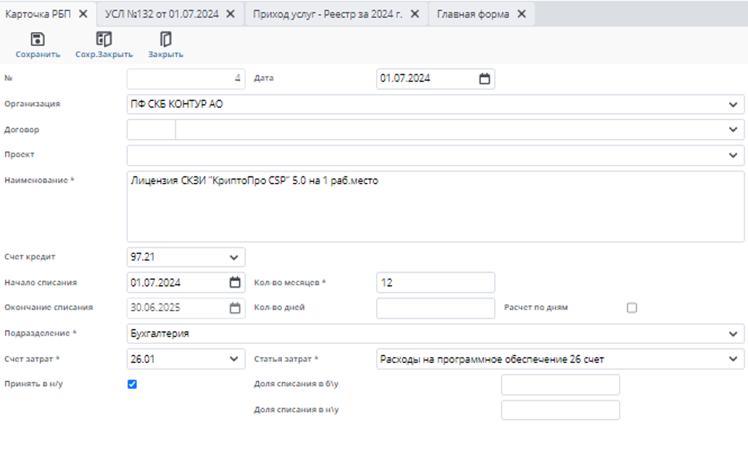 • Принят в н/у (признак принятия РБП к налоговому учету);