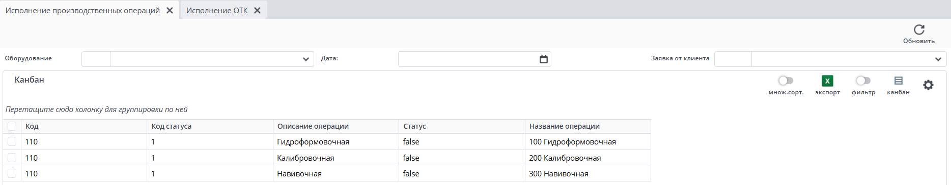В данном примере можно увидеть, что изделия по одной из операций должны пройти через Отдел технического контроля. То есть при завершении этой операции, она отобразится в канбане "Исполнение ОТК". При этом в канбане "Исполнение производственных операций" можно увидеть, что надпись "ОТК" загорелась желтым.