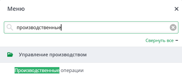 Документ предназначен для учета операций, совершаемых при изготовлении готовой продукции. Для работы с документом Производственные операции необходимо перейти в Меню – найти группу Управление производством – открыть документ Производственные операции.