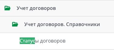 Для просмотра реестра Видов договоров и/или создания нового документа, необходимо в Меню перейти в Учет договоров – Учет договоров. Справочники– Статусы договоров.
