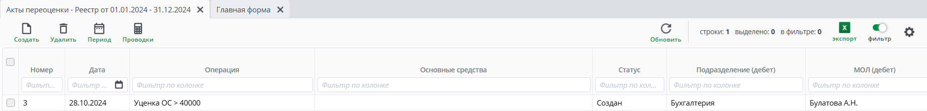 В системе для отражения увеличения первоначальной стоимости основных средств по бухгалтерскому и налоговому учету, а также для изменения срока их полезного использования предназначен документ «Акт переоценки». Найти его можно в главном меню системы. После нажатия на документ откроется реестр Актов переоценки