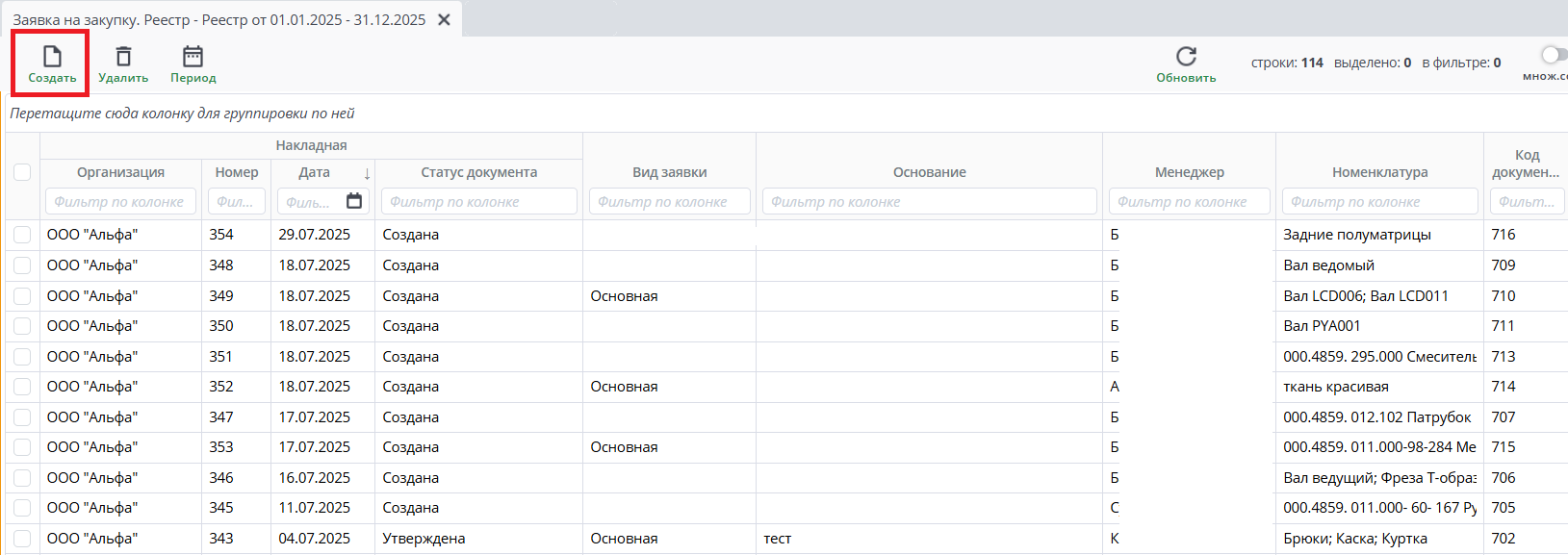 Для этого, нам нужно нажать на кнопку "Создать" в реестре Заявок на закупку.